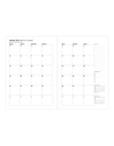 • monthly overview before each month, including goals, trackers, to dos and special dates