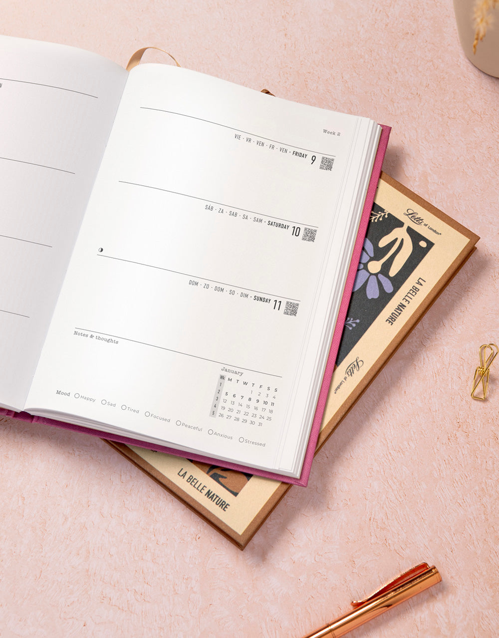 Embellish your plans with the charm of nature with La Belle Nature planner in A5 size. This beauty features a stunning floral design, framed in a soft cream border that adds a touch of elegance to the vibrant cover. Crafted with a durable, textured paper cover, this new gem brings the essence of the outdoors into your everyday planning. Week to view planner layout.