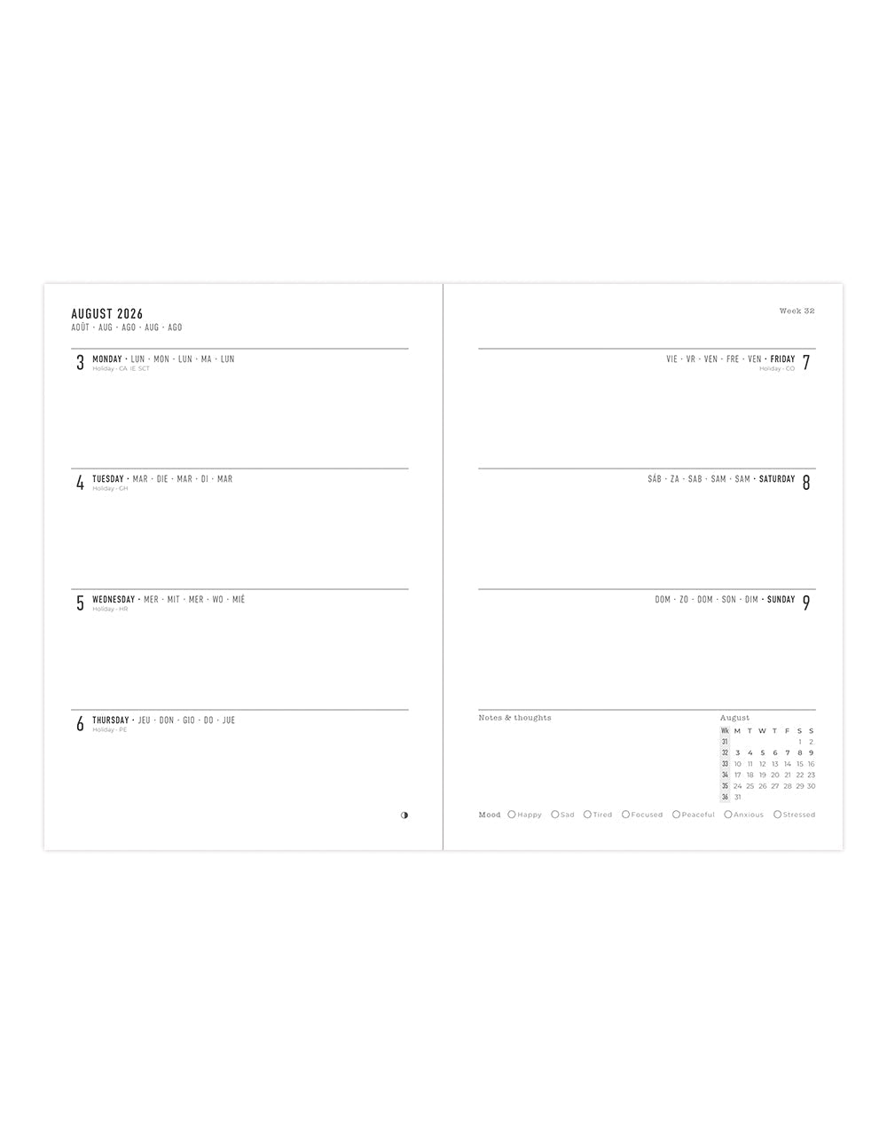 Multilanguage week to view planner in English, French, German, Italian, Dutch and Spanish.
