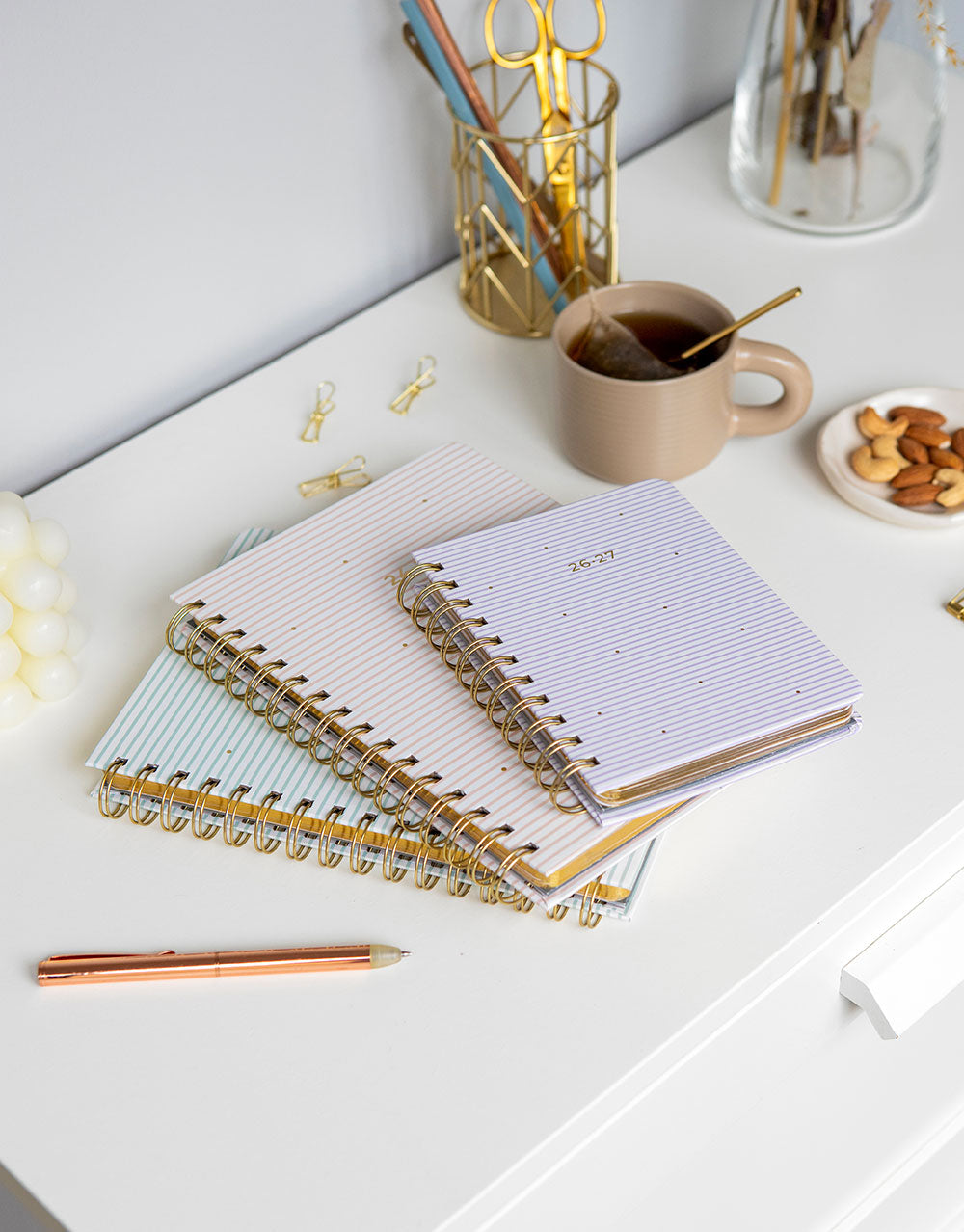 There is nothing more blissful than being on a beach, daydream about your favorite days spent at the seaside with this wiro bound 2026-2027 planner in A5 size from the Stripes Collection. Featuring a stylish striped design with gorgeous gold foil accents on a matt laminated cover.